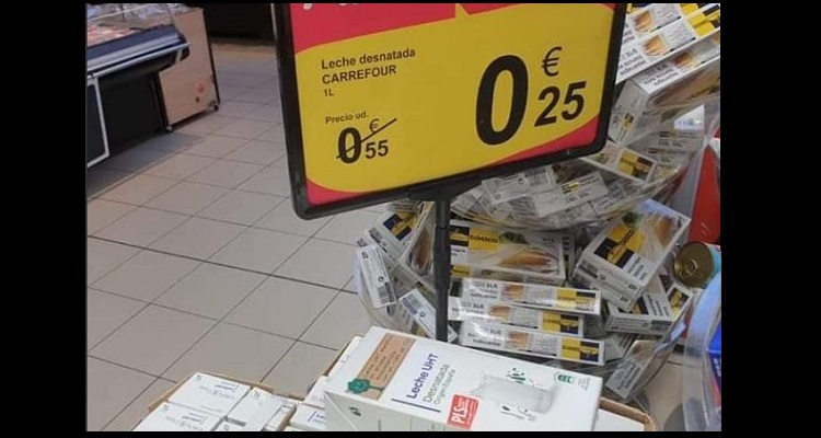 Según COAG-Castilla y León, Carrefour está vendiendo leche a pérdidas, algo que es ilegal en nuestro país. Todo vino por esta polémica imagen donde se puso a la venta leche desnatada a un precio de 0,25 euros el litro. El problema es que al ganadero supuestamente le cuesta 0,34 euros el litro, por lo cual, en teoría hay pérdidas.
