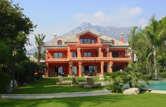 Una vivienda en primera línea de playa en Marbella en Urbanización Santa Petronila, que cuenta con nada menos que 8000 metros cuadrados repartidos en 12 dormitorios distribuidos en 3 edificios. Tiene una gran fuente de piedra en su entrada principal. Su precio es de 55 millones de euros.