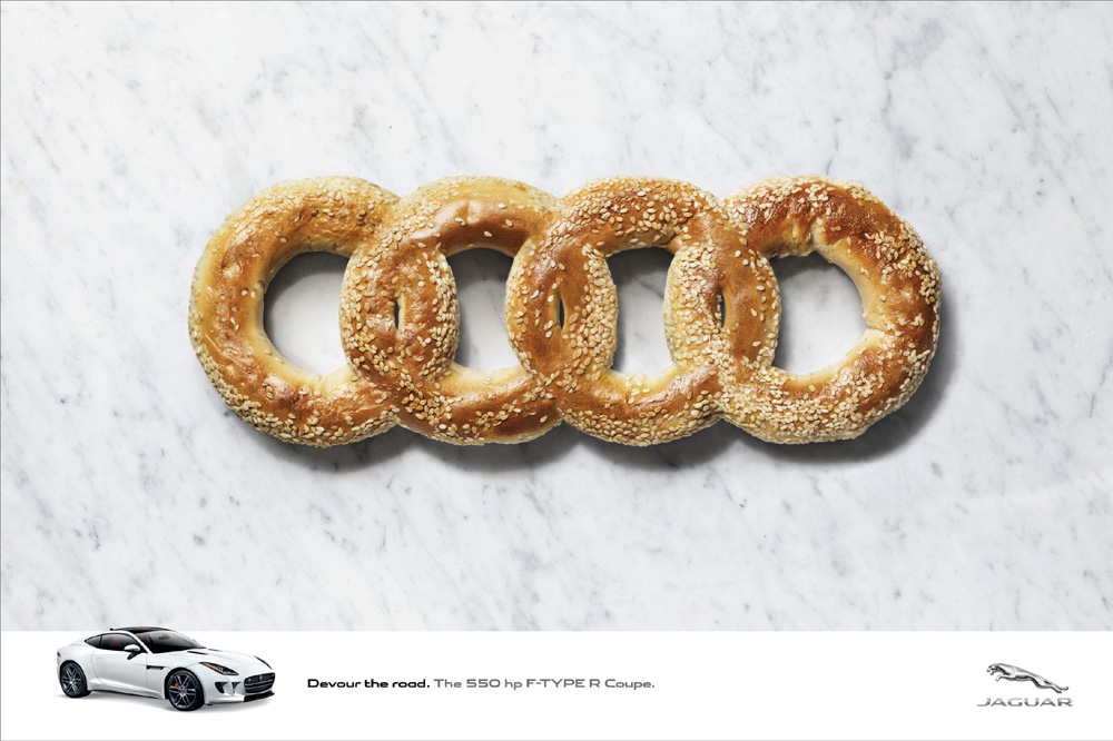 Lo que hizo el publicista de Jaguar es usar carteles publicitarios con los logotipos de la competencia citada anteriormente pero hechos con comida e insinuaba que se los podía comer cuando quisiera…
