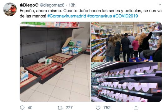 Esa fue la reacción de los ciudadanos poco después del anuncio del ministerio de Sanidad y la Comunidad de Madrid, de suspender las clases en los centros educativos durante 15 como medida de control para el contagio del coronavirus, que ya cuenta con más de 1.200 afectados en toda España. El pánico se ha apoderado de los madrileños, que pocos minutos después de las declaraciones de Ayuso, se lanzaban a los supermercados por el temor a posibles curentenas que puedan mantener aislados en casa.