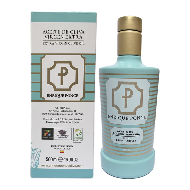 Enrique Ponce debuta en el mundo del aceite con una cosecha temprana de marcada personalidad. Una botolla con un diseño elegante e impecable. El aceite es ideal para el aliño de ensaladas o como perfecto acompañante de tostadas de pan en el desayuno.