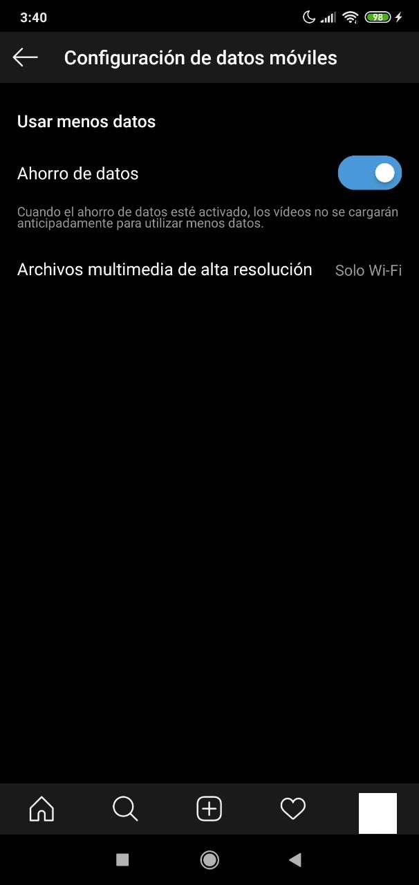 Eso sí, hay una forma de evitar esto. Si vas a ajustes, cuenta y uso de datos del móvil, podrás activar un modo de ahorro de datos. Con este ahorro, solamente cargarán los vídeos cuando pases por ellos, en vez de cargar varios automáticamente. Yo lo probé y la verdad que funciona, pues gasté la mitad de datos y no noté casi la diferencia.