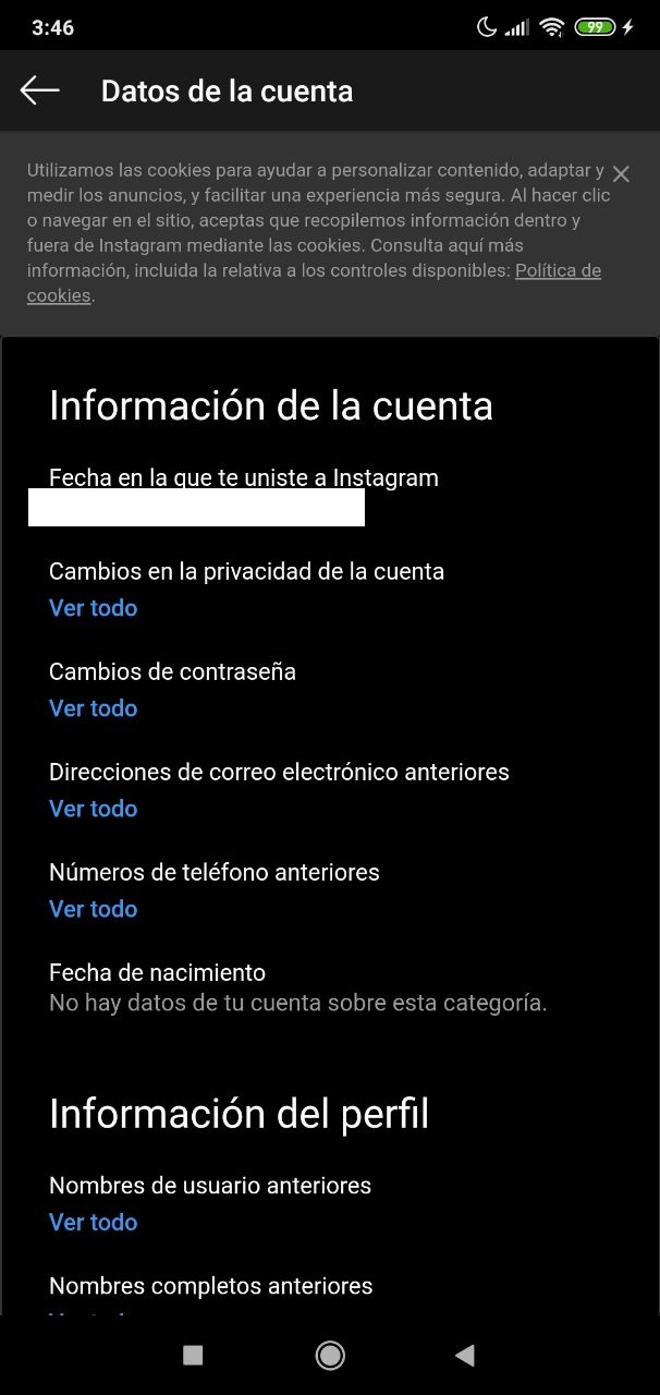 Si entras al apartado de seguridad en ajustes y luego pinchas en “acceder a datos”, podrás acceder a datos interesantes. Por ejemplo, podrás ver todos los correos electrónicos que tuvo la cuenta, los cambios de privacidad, las direcciones de correo, los números vinculados y los nombres de usuarios anteriores.