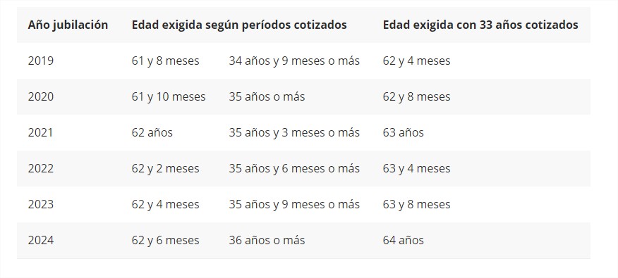 Debe haber sido un trabajador contratado a jornada completa en relación con lo indicado en el convenio colectivo. Pero si ha sido un trabajador discontinuo no será considerado trabajador fijo, aunque en sus períodos de trabajo hayan hecho jornada completa. También se debe tener una edad mínima según este recuadro: