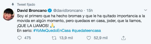 Pero este viernes Broncano cambiaba de actitud, poniéndose mucho más serio ante la grave situación que se está viviendo en España y el resto de mundo. Lo expresaba en Twitter con una publicación en la que hacía un llamamiento a la precaución: “Soy el primero que ha hecho bromas y que le ha quitado importancia a la movida en algún momento, pero quedaos en casa, joder, que la liamos, ¡QUE LA LIAMOS!”. El humorista se sumaba así al movimiento #quedateencasa y #YoMeQuedoEnCasa. El tuit ha tenido una enorme repercusión y solo en los primeros diez minutos, contaba con más de 4.000 likes y 1.000 retuits. Además, también manifestó su opinión política reconociendo la labor y la importancia de los servicios públicos y lo fundamental que es evitar se su presupuesto se reduzca. Una declaración que ha despertado mucha polémica entre las personas que están conectando la presencia de una pandemia mundial, con la actuación de determinados políticos.