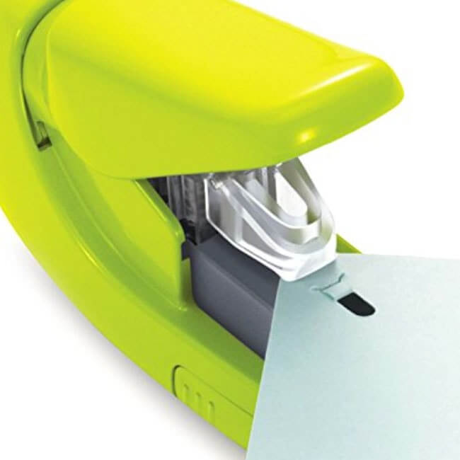 Esta vez trajo una grapadora que es capaz de unir hojas de papel sin usar una grapa metálica. Eso supone un ahorro, evita que necesites comprar recambios para la grapadora, y luego, si quieres liberar los papeles, no tendrás que retirar las grapas. Lo hace simplemente perforando el papel y haciendo un pliegue en el interior del agujero.
