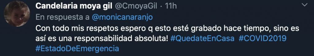 «Mónica, no sabes lo mucho que te admiro», le escribe una tuitera. «Pero ahora es momento de estar en cuarentena y evitar las reuniones innecesarias. Por favor, cuídate y cuida a los que te rodean», le dice.