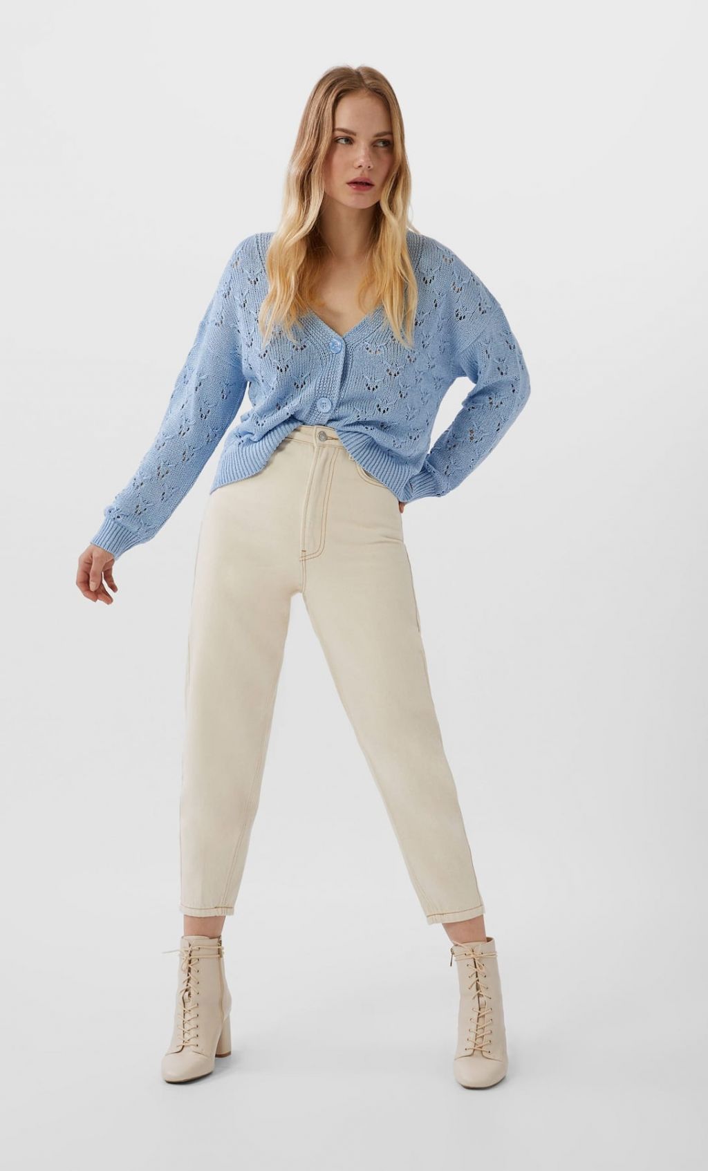 Y no hay nada mejor que hacerlo a la moda. Este cárdigan calado de Stradivarius, con ese bonito tono azul cielo, nos servirá para cubrirnos esos días que las temperaturas sean más frescas.