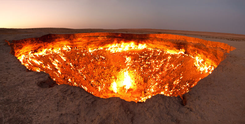El nombre real en turcomano es pozo de Darvaza, y no es algo natural. También ha sido creado por el nombre, ya que fue una antigua prospección de gas ubicada en el desierto de Karakum.