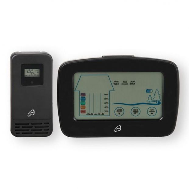 Una estación meteorológica que tiene sensor exterior inalámbrico con indicador de temperatura exterior, interior y de tendencia. Con reloj autocontrolado y con ajuste automático de hora y fecha.