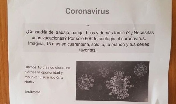 Es difícil no recordar el cartel que un individuo colgó en uno de los soportales de su localidad y que se hizo viral en Twitter. En esta ocasión no se trata de algo tan serio como lo anterior (esperamos). Lo cierto es que, tal y como se aprecia en la imagen, algunas personas han recogido parte de los recortables, como si estuviesen interesados en la oferta. ¿Qué dice el anuncio? Este vecino pidió 60 euros por contagiar a la gente con coronavirus. “Imagina, 15 días en cuarentena, solo tú tu mando y tus series favoritas”, dice el comunicado. Esto se produjo a primeros de marzo, cuando ‘solo’ había 1.500 afectados.