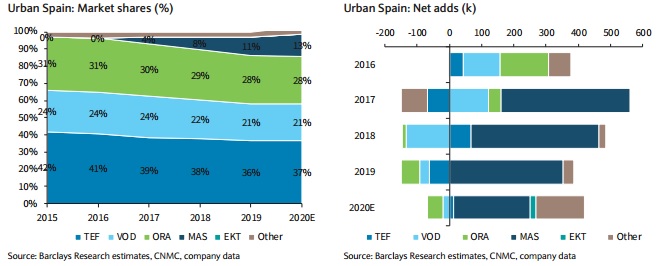 Así, en la principal área, la que Barclays llama «urbana», donde fija unos 11 millones de usuarios de banda ancha, y que engloba a las ciudades importantes como Madrid, Barcelona, Valencia, Sevilla, Málaga, Zaragoza, Murcia, Alicante y Córdoba, esperan que MásMóvil aminore el ritmo de captación y, poco a poco, trabaje más en la retención. Se trata de zonas donde ha tenido un amplio crecimiento, debido al alto índice que portabilidades que presentan estas regiones, y ahora el crecimiento será menor.