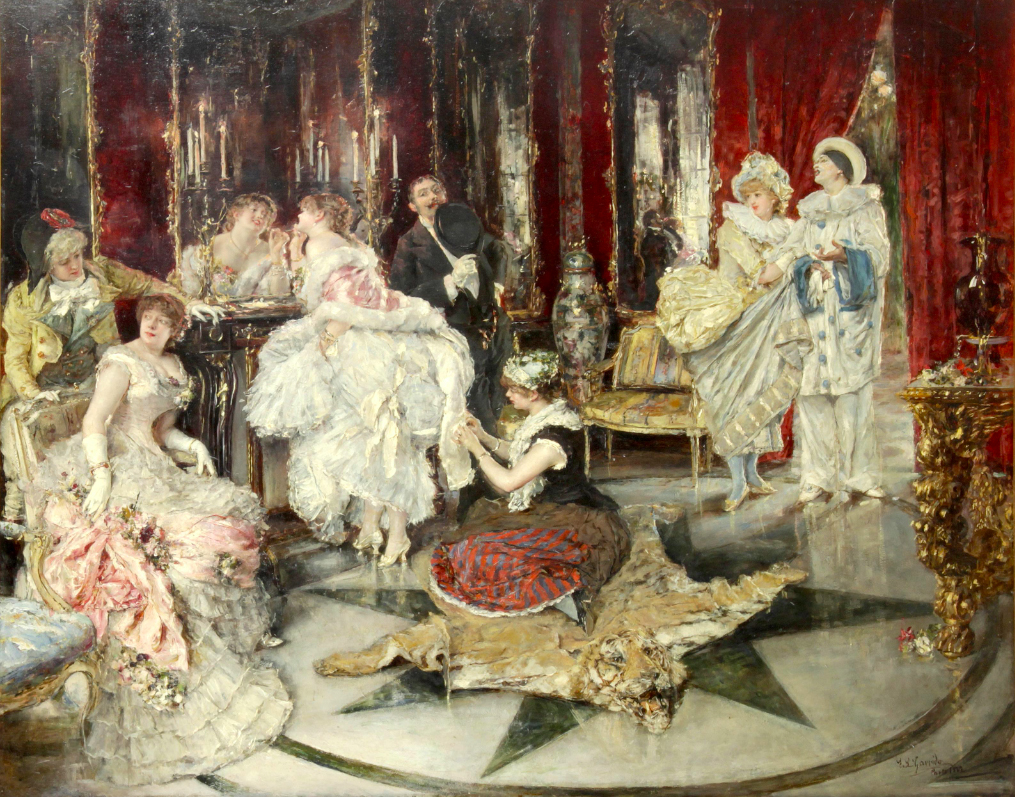 La pintura ‘Al baile’ de Eduardo León Garrido es una pieza que encaja a la perfección en la obra completa del pintor. León Garrido es bien conocido por su perfil costumbrista, al tiempo que por sus escenas de baile en salones muy recargados. Con esta descripción de escena podemos referirnos perfectamente a la obra a subasta, fechada en 1882.