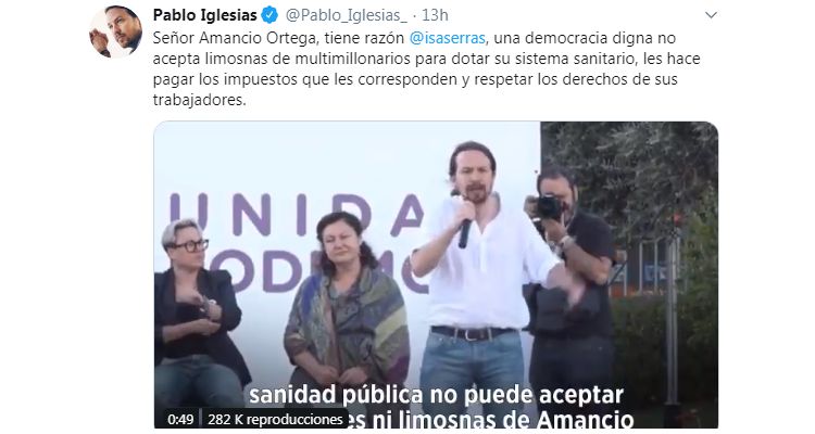 Eso sí, las principales críticas por parte de Pablo Iglesias vienen por este informe de “Los Verdes” de Europa. En concreto, el informe dice que el Grupo Inditex ha eludido unos 600 millones de euros en 3 años. Sí del 2013 al 2017, Amancio ha donado 33 millones en área educativa y 114 millones en la social, siguen faltando 450 millones de euros para cubrir lo supuestamente eludido. Por ello, en Podemos reclaman que debería pagar impuestos en vez de donar.