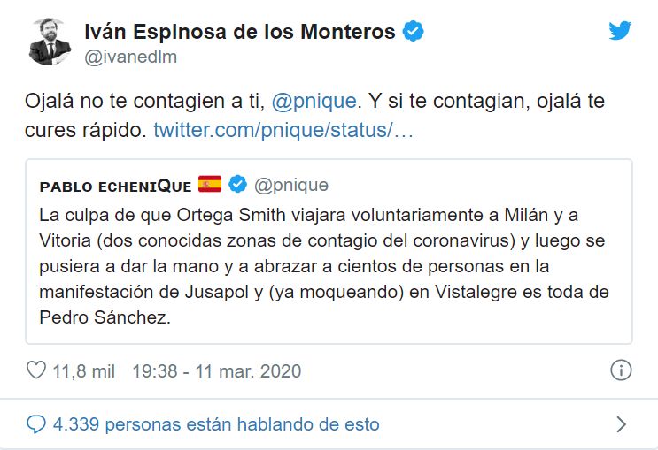Como es lógico, siendo VOX y sus militantes tan activos en Twitter, la respuesta de Iván Espinosa de los Monteros, diputado del partido en el Congreso, no tardó en llegar. Y lo hizo citando el propio mensaje que había lanzado anteriormente Echenique para recalcarle algunas apreciaciones. Las indirectas a través de la red social son el pan de cada día para muchos oponentes políticos.