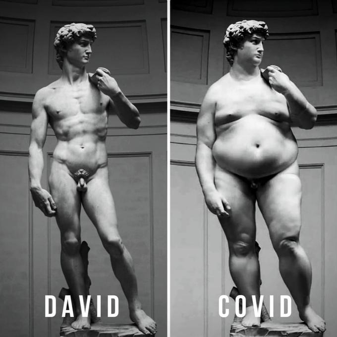 La mayoría de la gente está engordando en confinamiento (aunque otros estamos adelgazando), algo que también se ha convertido en un meme. Por ejemplo, uno de los más graciosos es el de llamar a la escultura de David “Covid”, en referencia al virus. En la de “Covid”, se puede ver que ha perdido la forma y se ha vuelto un hombre obeso.