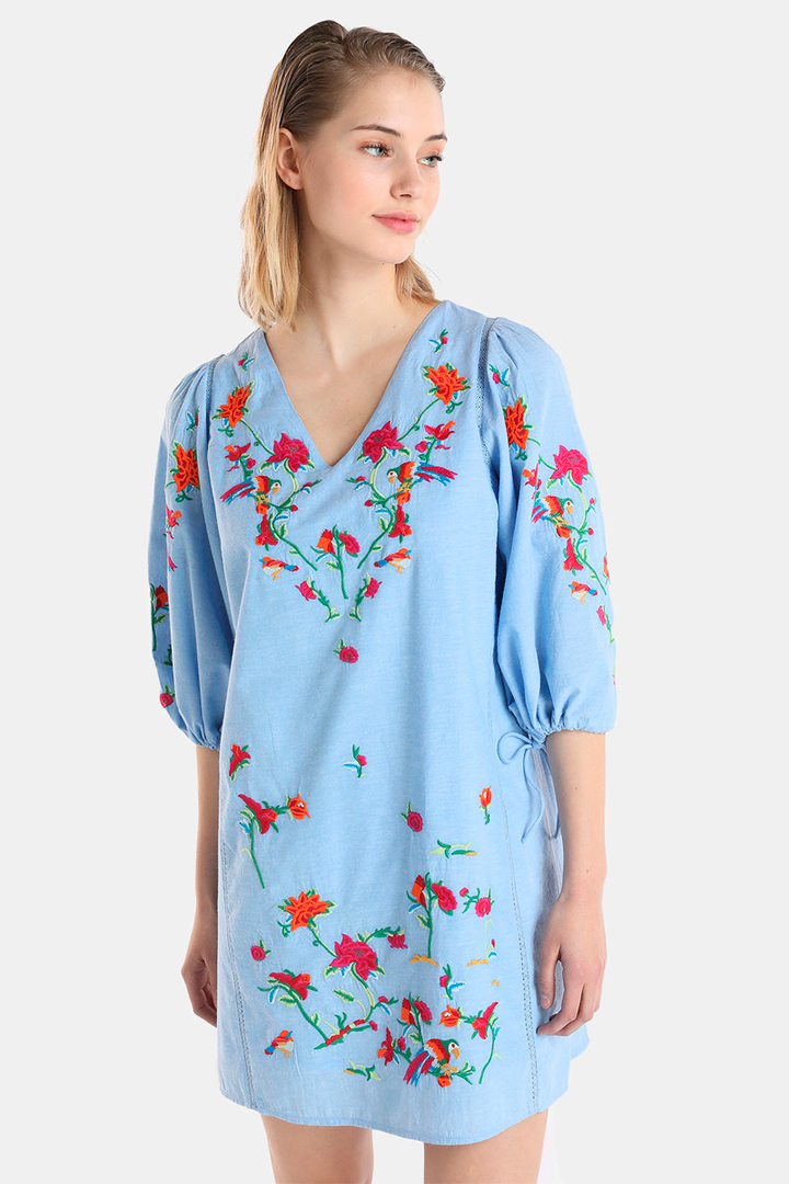 Con este vestido azul de bordados florales serás el centro de todas las miradas. El bonito contraste que ha sabido crear la marca Fórmula Joven irá genial con sandalias o con cuñas de esparto.