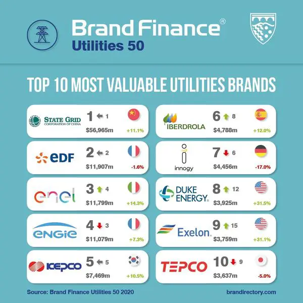 Por países, Estados Unidos domina el ranking ‘Brand Finance Utilities 50 2020’ con 20 marcas, mientras que las compañías alemanas se tambalean con tres de las caídas más fuertes del ranking.