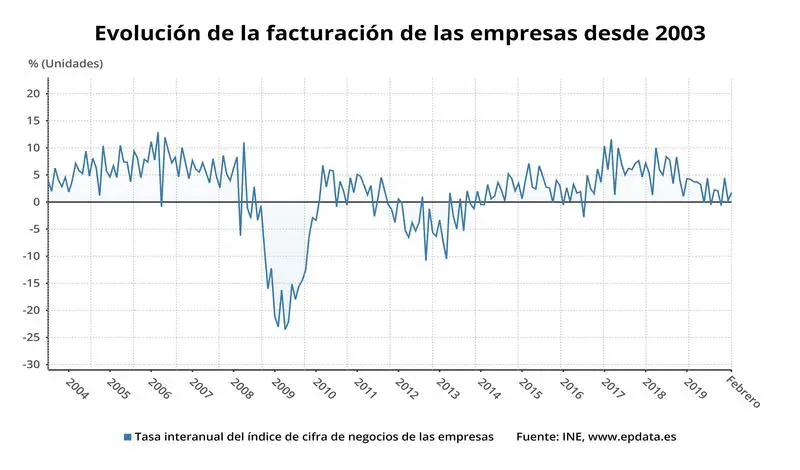 La cifra de negocios de las empresas subió un 1,7% el pasado mes de febrero respecto al mismo mes de 2019, en contraste con el avance del 0,3% experimentado en enero, según el Índice de Cifra de Negocios Empresarial (ICNE) publicado este lunes por el Instituto Nacional de Estadística (INE).