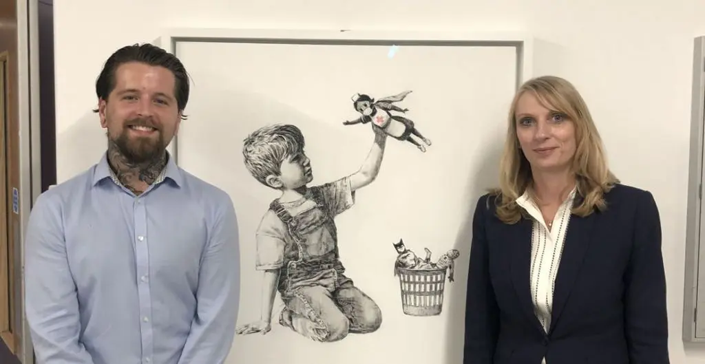 En una nota que añadió el misterioso artista al cuadro, se podía leer: «Gracias por todo lo que estáis haciendo. Espero que esto ilumine un poco el lugar, incluso si es solo en blanco y negro». Paula Head, la directora de este centro hospitalario, posó al lado del cuadro: «Muy orgullosa de revelar esta increíble obra de arte Pintando para los santos, creada por #Banksy como agradecimiento a todos los que trabajan con y para el NHS y nuestro hospital», escribió en Twitter.