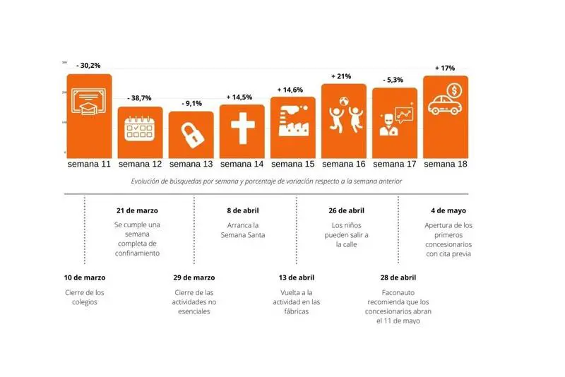 Precisamente, el momento de mayor caída en las búsquedas en los portales de automoción durante la crisis sanitaria, con un 60% menos respecto a los niveles anteriores al coronavirus, coincidió con la semana del 23 al 29 de marzo, cuando el Gobierno anunció la primera prórroga del estado de alarma.