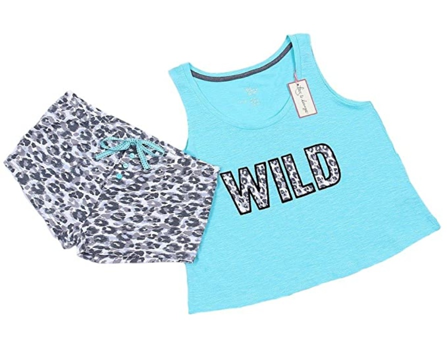 Este es el último producto de Primark que encontrarás en Amazon. Se trata de un pijama con unos pantalones de estampado animal print, y una parte superior en color turquesa con la palabra Wild en grande y estampado en su interior.