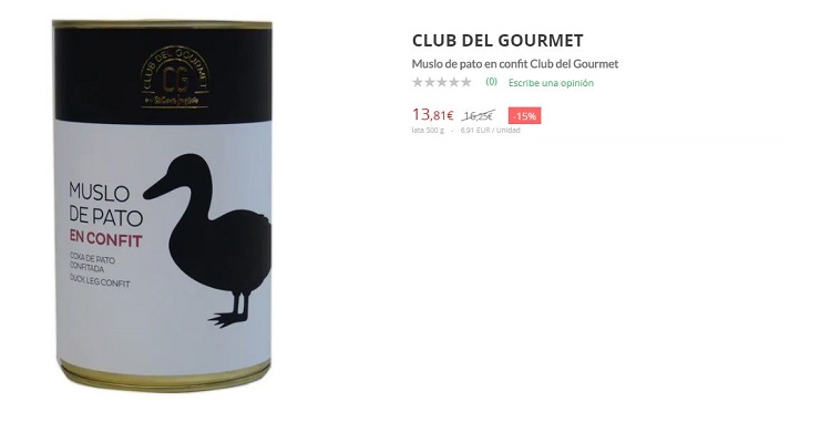 El siguiente producto es este muslo de pato en confit del Club del Gourmet. Se trata de un plato hecho con los prestigios patos de raza Moulard, criados en semilibertad y con una alimentación con maíz de alta calidad.