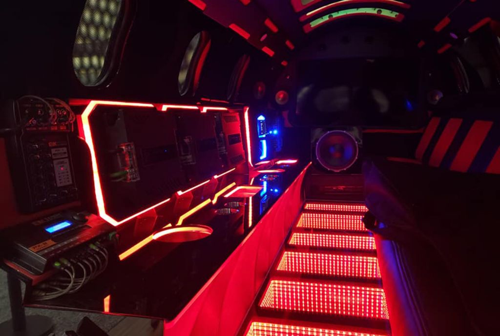 En su interior puedes encontrar altavoces de 4500 vatios, un buen equipo de música, luces estilo discoteca para recrear un buen ambiente festivo, varias pantallas, y un buen número de asientos para los 16 – 18 ocupantes que admite.