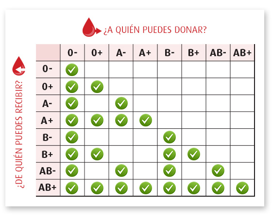 AB-: puede donar a los de su tipo más los de AB+ y recibir de todos los tipos negativos.