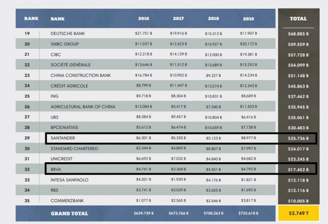 A pesar del esfuerzo y de que todos los bancos españoles llevan en sus planes estratégicos cumplir con estas medidas, Santander y BBVA siguen generando polémica porque se encuentran entre los 35 bancos del mundo que más invierten en combustibles fósiles.