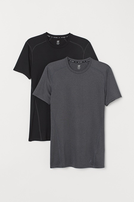 Viniendo en un pack de dos prendas como se muestra en el catálogo deportivo de H&M, es una camiseta especial para hacer running y correr, así como de otros ejercicios y entrenamientos físicos que puedas llegar a hacer. De manga corta en tejido funcional, sus materiales son transpirables de secado rápido manteniéndote seco en todo momento; es de corte ajustado.