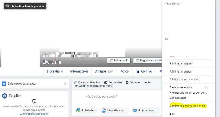Este diseño no se suele activar por defecto, sino que viene desactivado. El usuario lo debe activar, algo que puede hacer de una forma muy sencilla. Para ello, debes pinchar en la flecha que aparece en la esquina superior derecha y buscar el apartado que dice “cambiar a la nueva versión”, justo encima de la opción de salir.