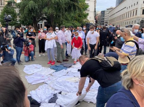 Durante el acto, los chefs, que llevaban puestos guantes, mascarilla y sus chaquetillas de cocinero, han dejado sus chaquetillas dobladas frente al Congreso.