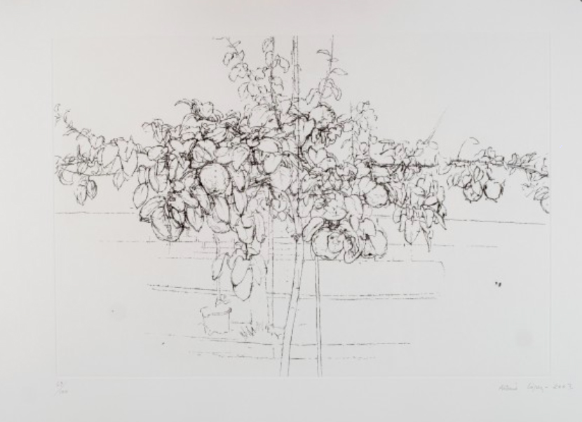 ‘Árbol frutal’ es la obra de Antonio López a subasta. Sus dimensiones son 50×70 centímetros y la técnica utilizada por el artista es el aguafuerte y la punta seca y barniz blando. Todo ello sobre papel Somerset Satin White de 300 gramos. Esta técnica es recurrente en la obra del madrileño, pero también en Goya y Picasso.