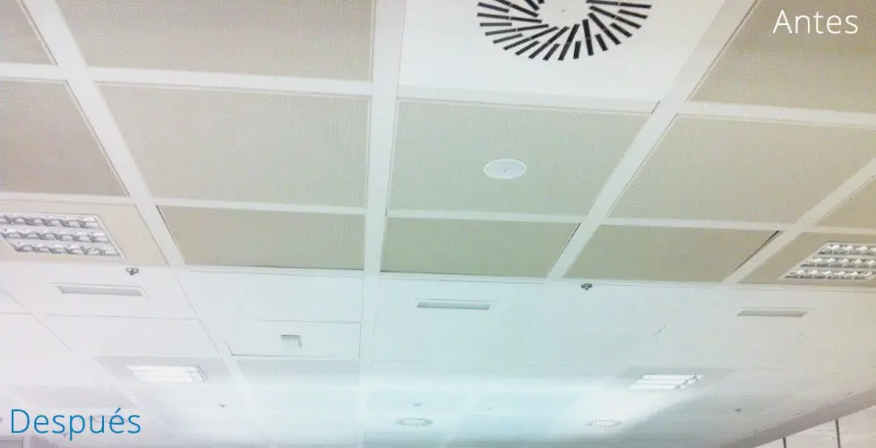 De esta manera se evita el deterioro del techo y una posible sustitución a futuro, que suele ser costosa y paralizar la actividad en los inmuebles: Por ello la limpieza y un correcto tratamiento es lo devuelve a un falso techo su aspecto original, y no solo eso, sus atributos acústicos, estéticos y técnicos.