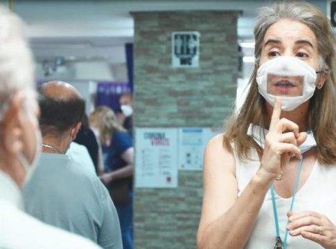 Estas mascarillas de protección, que incorporan una parte transparente, permiten la lectura labiofacial y, con ella, la comunicación de las personas sordas mediante la lectura de labios. Con esta entrega, 600 personas adscritas a esta asociación madrileña ven facilitada su comunicación con el entorno, tras la obligación de utilizar esta medida de protección individual en el conjunto de la sociedad.