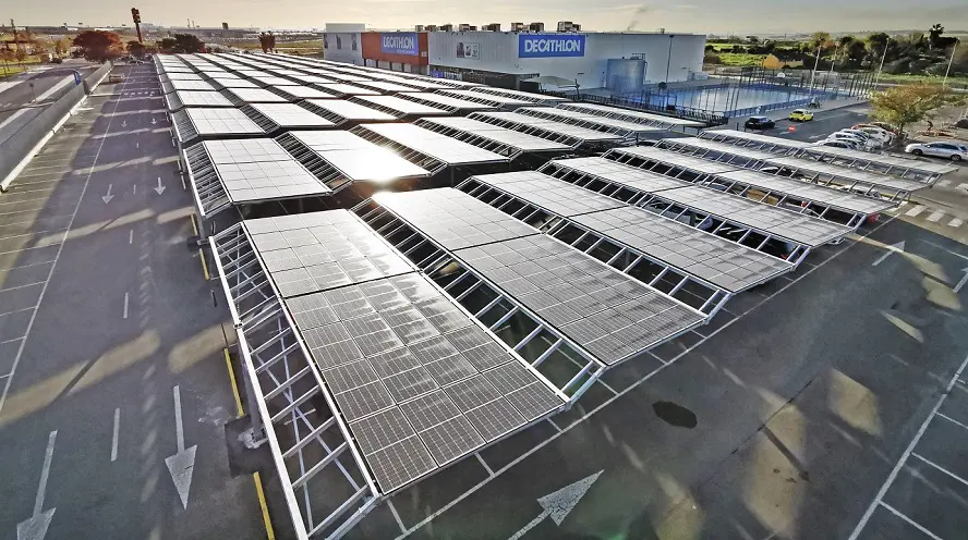 Una vez logrado este objetivo, Decathlon ha querido dar un paso más con la construcción de la primera planta fotovoltaica en marquesina destinada al autoconsumo en el municipio sevillano de Alcalá de Guadaira.