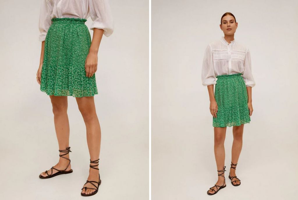 No hay duda de que Mango quiere vestir a una mujer muy femenina, elegante, y muy alegre. No hay más que ver esta divina falda plisada de corte tradicional acampanado disponible en dos preciosos colores: azul cielo y verde esperanza. Mango retoma este verano su apuesta por las cinturas elásticas ribeteadas, perfectas para combinar con tops cortos o blusas amplias. La falda de verano incluye un forro interior de poliéster fino, que no aportar calor y ayuda a que la falda siente mejor aún. Este modelo está confeccionado, además, con fibras y procesos sostenibles.