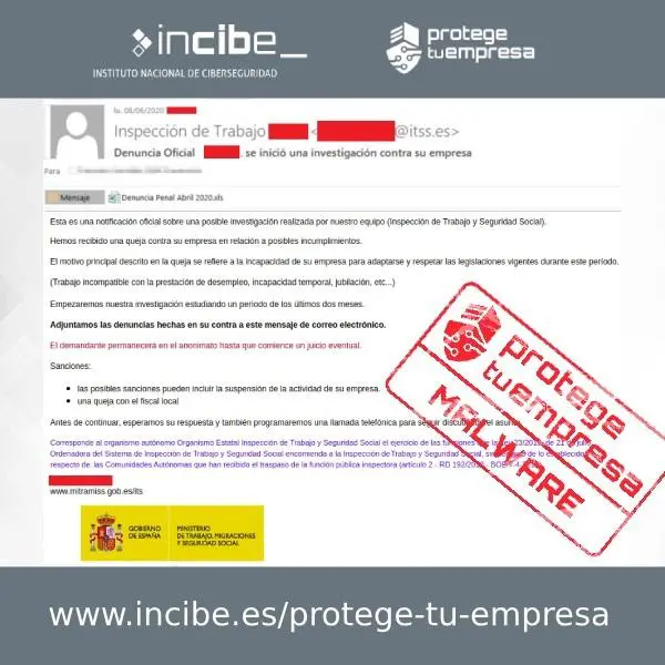 El Instituto Nacional de Ciberseguridad (Incibe) ha alertado de una campaña de correos electrónicos fraudulentos que suplantan a la Inspección de Trabajo y a la Seguridad Social para robar credenciales de acceso a la empresa y otros datos privados.