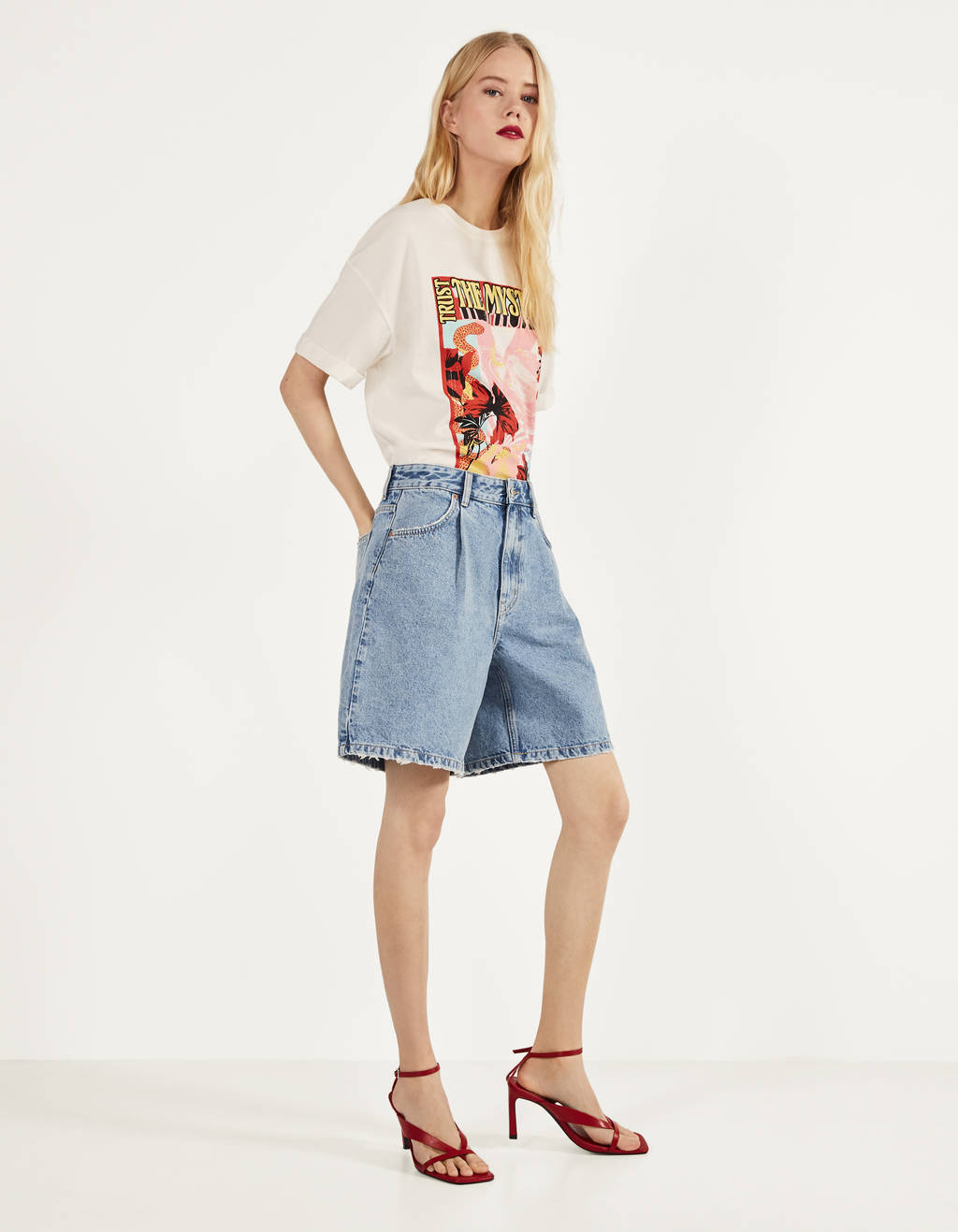 Si prefieres unas bermudas de tela vaquera, las cuales no has podido encontrar en Zara, no pasa nada, pues en Bershka tienen un diseño perfecto para ti. Se trata de un pantalón bastante más ancho que los demás que has podido anteriormente, por lo que no puede ser más perfecto para el verano. Eso sí, aunque tengas pinzas en el frontal, resulta ser más adecuado para un día de paseo que para una cita elegante, aunque claro, todo depende de cómo lo complementes.