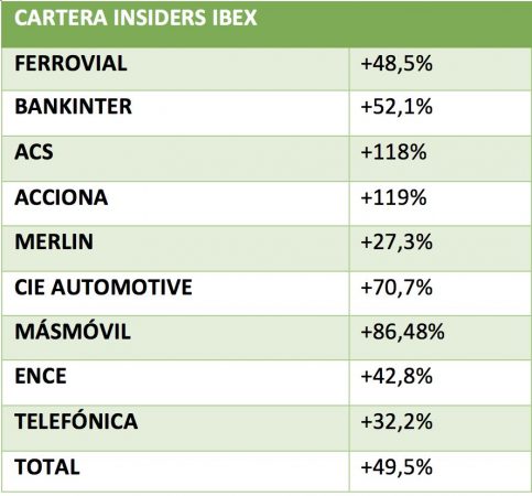 En este caso, saldrían de la lista: Telefónica, dado que solo Criteria Caixa estuvo comprando acciones de manera reiterada. Una situación igual a la de Cie que ha tenido en Elidoza Promoción su máximo sostén. En el caso de Ence tampoco llega a los tres. Por último, Acciona cuyos directivos si han comprado, cerca de una decena de ellos, pero las cantidades no llegan al mínimo. En este punto, la única duda es si se debe incluir a MásMóvil dada su singular situación, gran parte de su revalorización viene de la opa lanzada por KKR y Cinven. Pero, en este punto dos consideraciones importantes.