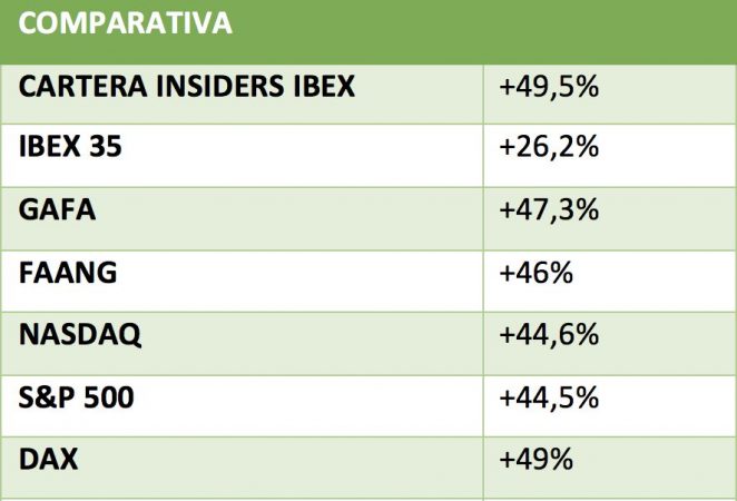 El Ibex es un índice de contrastes. Se puede comprobar con el paso de los meses, incluso de los años, que sistemáticamente es uno de los peores (por ser amables) del mundo desarrollado. Una cualidad que ha refrendado la pandemia del covid-19. Mientras, un pequeño grupo de firmas españolas logra duplicar la rentabilidad de la bolsa española, cerca de un 50% frente a un 26%. Aunque, va mucho más allá, ya que baten a las sagradas GAFA (Google, Amazon, Facebook y Apple), al Dax o a la renta variable americana. Lo más importante es que ese núcleo no pertenece a un sector disruptivo, simplemente tiene un pequeño nexo de unión: son las compañías donde sus directivos han comprado más acciones.