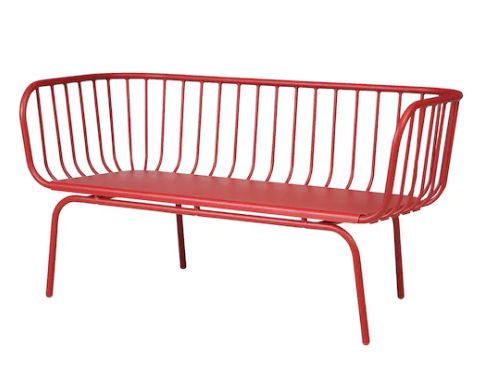 De color rojo, este pequeño sofá de Ikea, le da un aire de alegría a cualquier rincón exterior, sobre todo si le añadimos varios cojines decorativos. La estructura de acero, con un revestimiento en polvo, es muy duradero, no se oxida y no necesita ningún mantenimiento especial. Solamente hay que limpiarlo con un paño húmedo. Su precio es de 179 euros, con opción a financiación por 7,46 euros al mes.