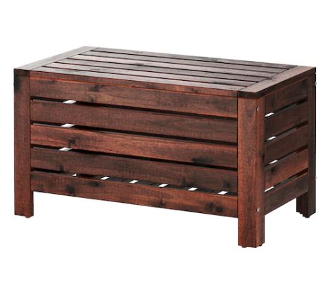 Si tenemos un jardín amplio, es casi necesario tener algún mueble para el almacenaje, ya sea para las herramientas de jardinería o los juguetes de los niños. Además tiene doble uso porque se puede utilizar como asiento, con unos cojines encima, o como mesa para apoyar objetos o alimentos. Está fabricado en madera marrón que ha sido tratada con barniz especial. Tiene unas medidas de 80×41 cm y su precio es de 50 euros.