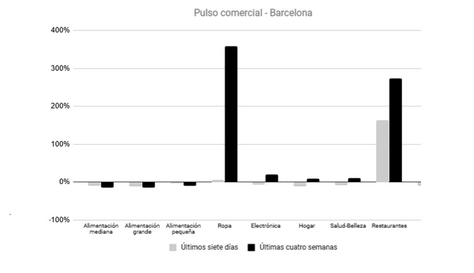 De hecho, en la ciudad condal el ritmo de recuperación está siendo menor que en otras grandes urbes. En la última semana, la actividad comercial ha crecido un 2%, frente al 16% de crecimiento de Madrid o el 9% de Sevilla. Si tenemos en cuenta la evolución del mes de mayo completo frente al mes anterior, Barcelona ha crecido un 22%, frente a los incrementos superiores al 30% de Madrid, Valencia, Sevilla e incluso de más del 60% de Tarragona.