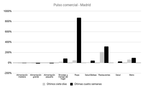 Por el contrario, grandes ciudades como Madrid y Barcelona, que tardaron más en dar el salto hacia la fase 2, se están recuperando a un ritmo más lento, y apenas superan en un 50% el nivel de actividad del mismo periodo del año pasado.
