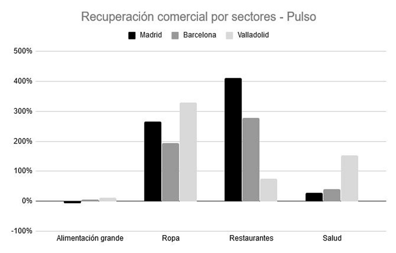 (Gráfico: Recuperación de la actividad comercial en el último mes de diferentes sectores en Madrid, Barcelona y Valladolid. Datos a 9 de junio. Fuente: Pulso)