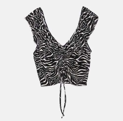Tiene un escote de pico y manga sisa, con detalle de frunce con cordones en pechera y volantes. Podrás optar por el color turquesa o bien el teja, cebra o negro. Quizá te animes a comprar uno de cada color, en vista del precio con la rebaja.
