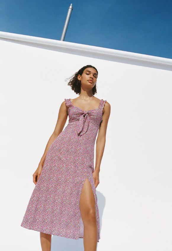 El siguiente vestido de Zara es este vestido con estampado de flores. Tiene un escote pico y tirantes de volantes. El tejido es elástico y tiene el tipo nido de abeja en la parte de la espalda. El bajo tiene apertura lateral y viene con un lazo en la parte delantera a modo de detalle. El cierre es con una cremallera lateral, la cual está oculta y no se ve.