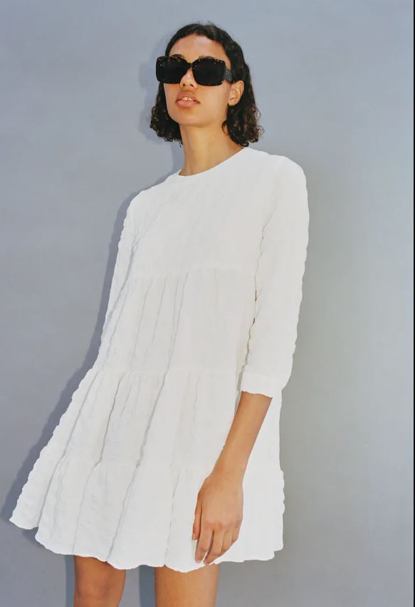 El siguiente vestido de Zara es este vestido estructura de color blanco. Es un vestido que tiene el cuello redondo y una manga que va por debajo del codo. Se pueden ver varios volantes a modo de detalle. En cuanto al cierre, está en la espalda y es de abertura y botón.